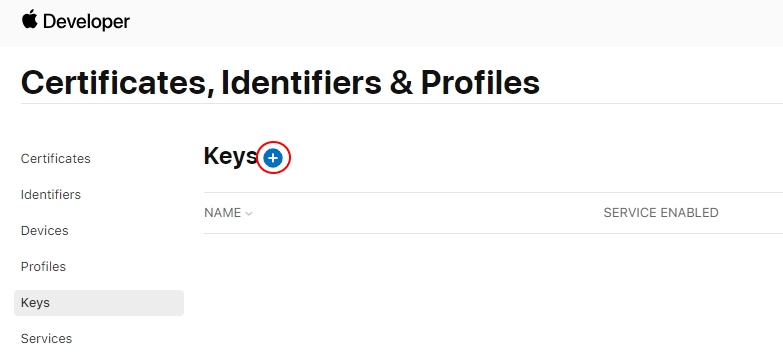 (1) 到 Apple Developer 主頁中,Certificates, IDs & Profiles 區域有一個 Keys 選項